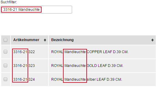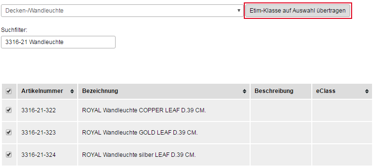 In der Ansicht, die sich öffnet, kann man über die Checkboxen eine beliebige Anzahl von Artikeln für die gemeinsame Bearbeitung markieren. Wichtig ist, dass man Artikel auswählt, die in die gleiche ETIM-Klasse gehören und die möglichst viele Gemeinsamkeiten haben. Wenn die Artikel, die man gemeinsam bearbeitet, zu unterschiedlich sind in ihren Merkmalen sind die folgenden Bearbeitungsschritte weniger effizient. Als Hilfe für das Auswählen der Artikel dienen die Sortierungsfunktionen der Tabelle und der Suchfilter. Wenn Ihre Artikel aussagekräftige Bezeichnungen haben, kann die Eingabe von einem oder mehreren Suchbegriffen durchaus die richtige Zusammenstellung von Artikeln liefern.