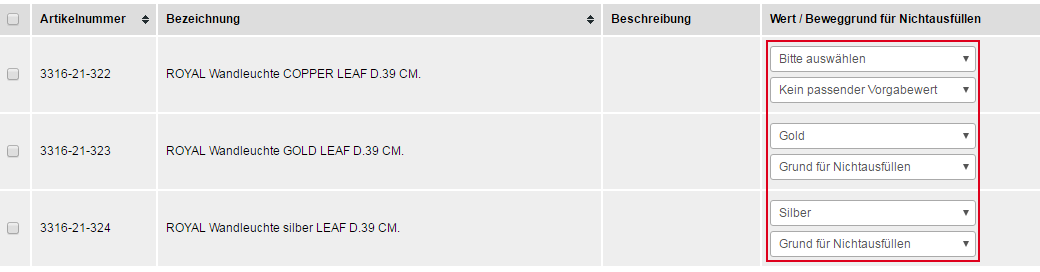 Bei Merkmalen, die nicht ausgefüllt werden können, muss anstelle des Merkmals der passende Grund gewählt werden. Das ist ebenfalls für einzelne Artikel oder für eine Auswahl von Artikeln möglich.