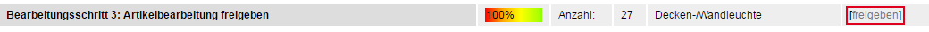 Bearbeitungsschritt 3: Artikelbearbeitung freigebenWenn die Merkmale einer Artikelgruppe vollständig gepflegt sind, erscheint ein weiterer Bearbeitungsschritt, der zum Freigeben der eingegebenen Daten dient. Ein Klick auf den [freigeben] Link bestätigt dem System, dass die eingegebenen Daten richtig sind und entfernt die Artikel aus dem Bearbeitungsmodus. Danach können Sie wieder bei Schritt 1 anfangen und die nächste Gruppe von Artikeln auswählen.
